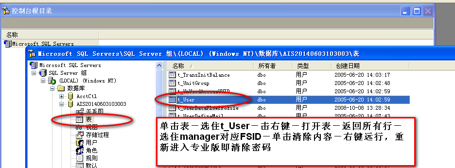 单击表-选住t_User-击右键-打开表-返回所有行-选住manager对应FSID-单击清除内容-右键运行