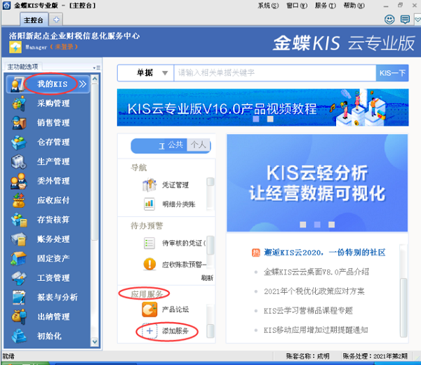 2、私有云或者许可模式,则可以先备份账套,再从软件主界面—【我的KIS】, 在应用服务——添加服务,搜索栏中录入反过账,搜索,添加即可。