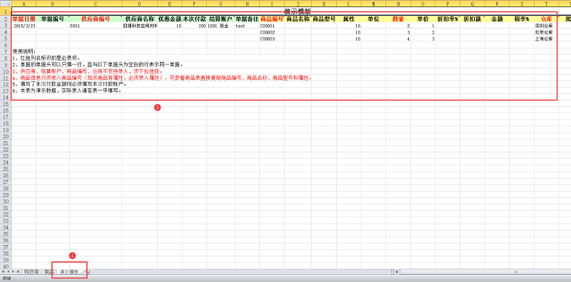 3、可点击表格中的【演示模板】,查看导入演示格式。
