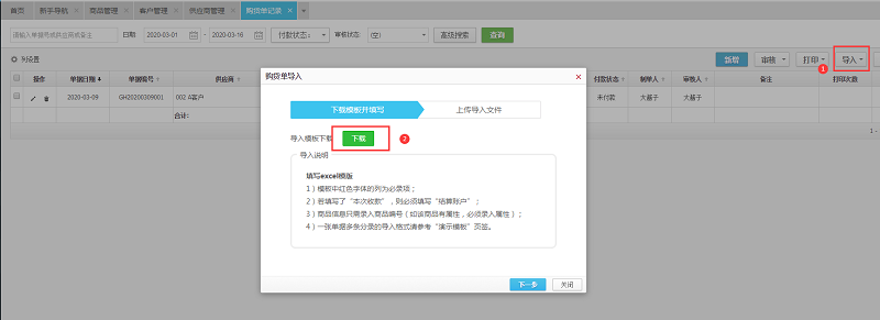 2、点击右上角【导入】,下载导入模板后,按照导入模板格式填写内容;