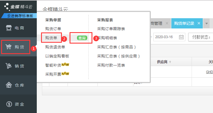 1、【购货】-【购货单】,鼠标悬浮在购货单上,点击【查询】,进入购货单记录界面;