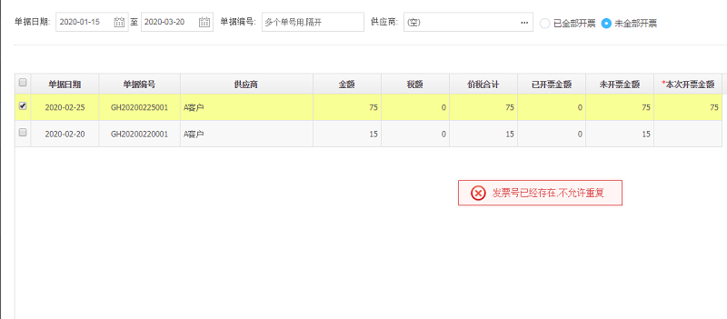 V3云进销存系统登记发票,提示:发票号已经存在,不允许重复!应该如何处理?