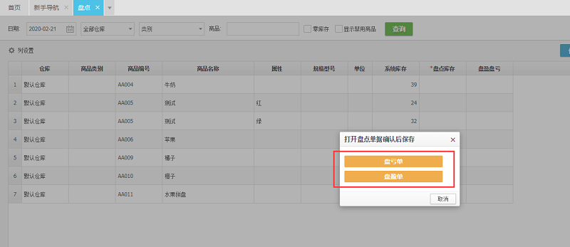 4、点击盘盈单,盘亏单,生成盘点数据;