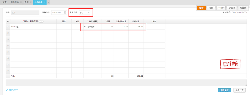 亏:点击盘亏单,生成其他出库单,点保存(审核)。