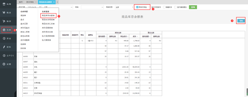 如何导出V3云进销存为0库存商品?