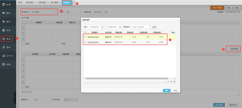 2、【资金】-【付款单】,选中应付单据的供应商后,点击【选择源单】
