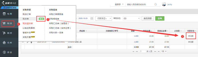 1、【购货】-【购货单查询】,查看供应商的付款状态为【未付款】状态,此单则为应付单据