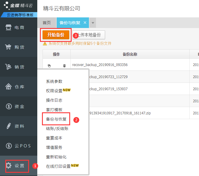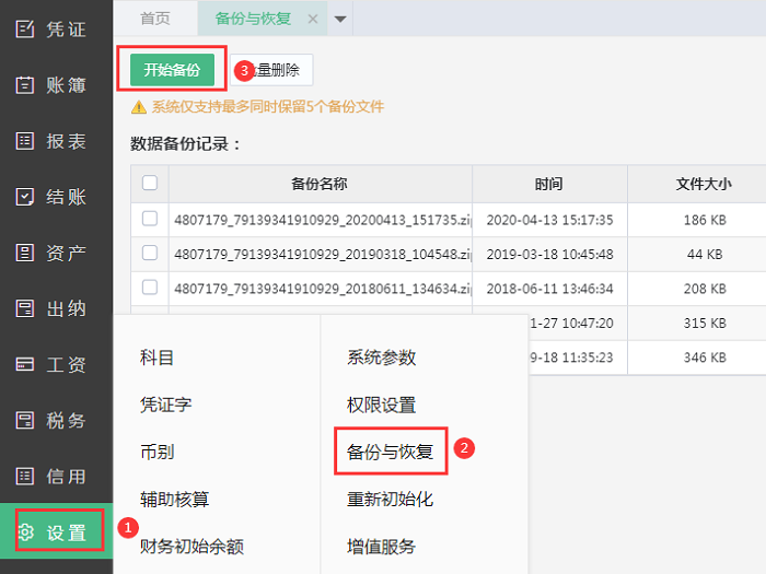 使用账套系统管理员账号,在【设置】-【备份与恢复】中点【开始备份】,可以将当前账套备份完成。