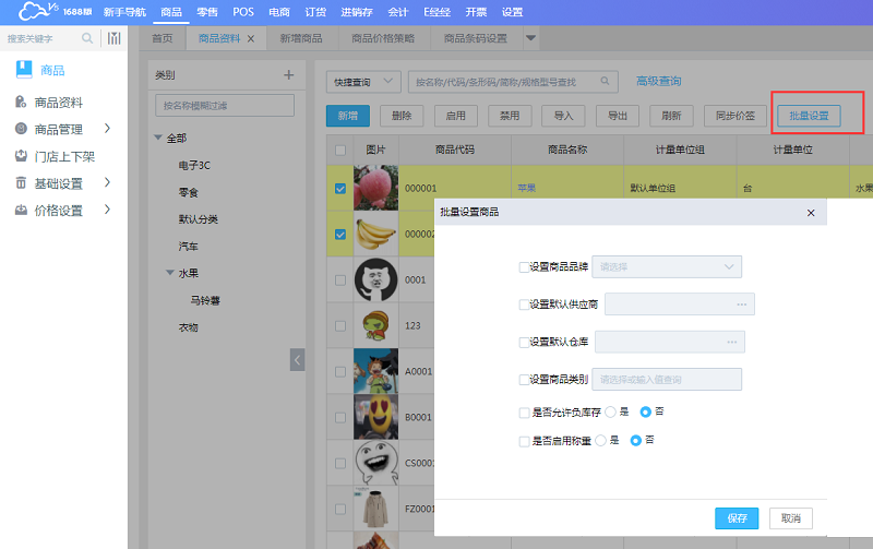 【商品】-【商品资料】里选择商品后点【批量设置】,可批量设置商品品牌、默认供应商、默认仓库、商品类别、是否允许负库存、是否启用称重