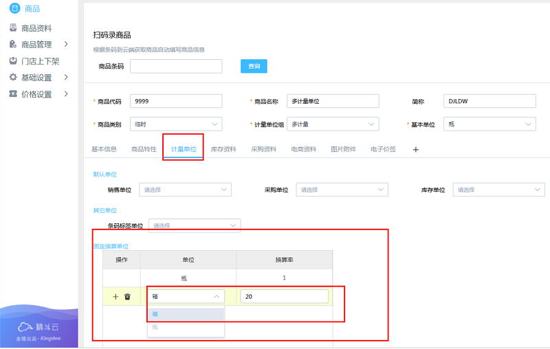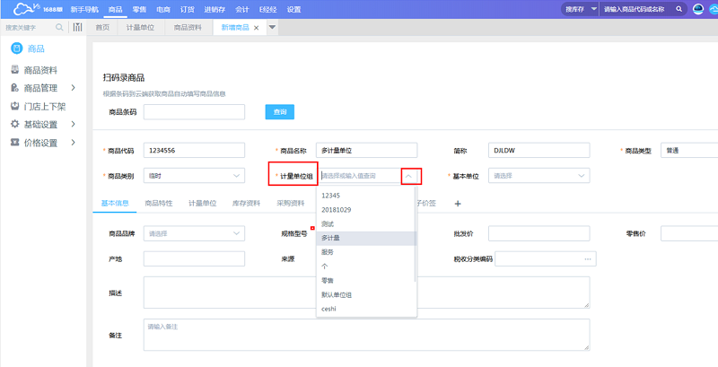 新增商品时选择对应的单位组