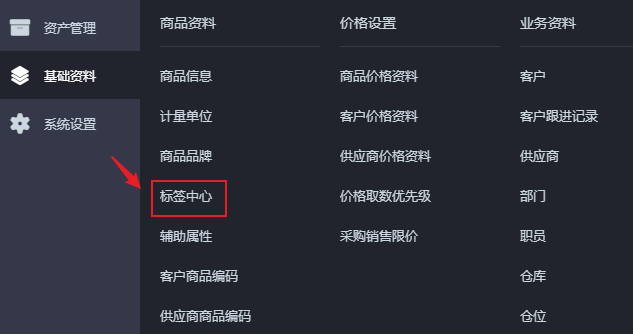 1)功能入口:在基础资料—标签中心里添加单据标签