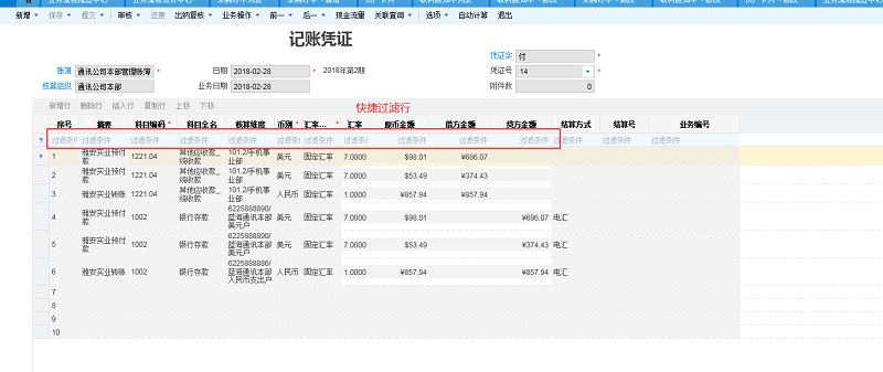 凭证单据体显示过滤行,实现金蝶软件快速搜索