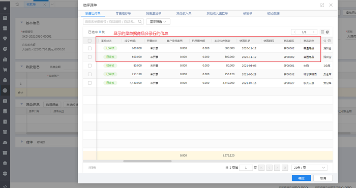 选择按分录核销时:以收款单为例,录入客户,单击【选源单】,系统会弹出“选源源单”窗口,在选源单窗口显示的会是单据分录明细,单击【确定】即会将选择的单据分录信息带入到收款单的“源单信息”表体显示。