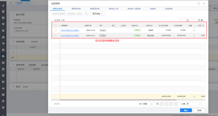 选择按单核销时:以收款单为例,录入客户,单击【选源单】,系统会弹出“选源源单”窗口,分别列示了收款单可关联收款的对应单据,包括:销售出库、销售退货、其他收入、其他收入退款、初始数据。选择对应单据,单击【确定】即会将选择的单据信息带入到收款单的“源单信息”表体显示。