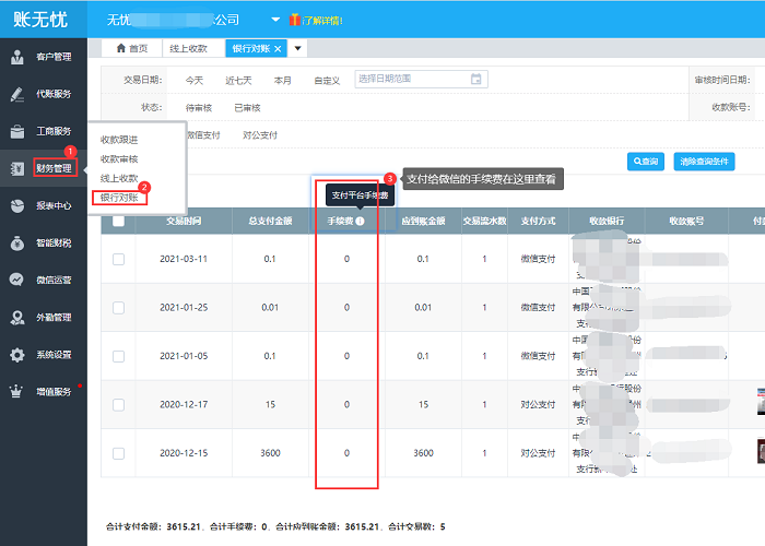 使用微信收款是0.38%的超低手续费率,可以大大节省公司成本,这个0.38%具体的是微信自动提现在交易的金额里扣0.2%+我们这边会在账无忧充值费用里扣0.18%(目前暂未收取,以当前实际情况为准),微信扣的手续费可以按下图进行查询: