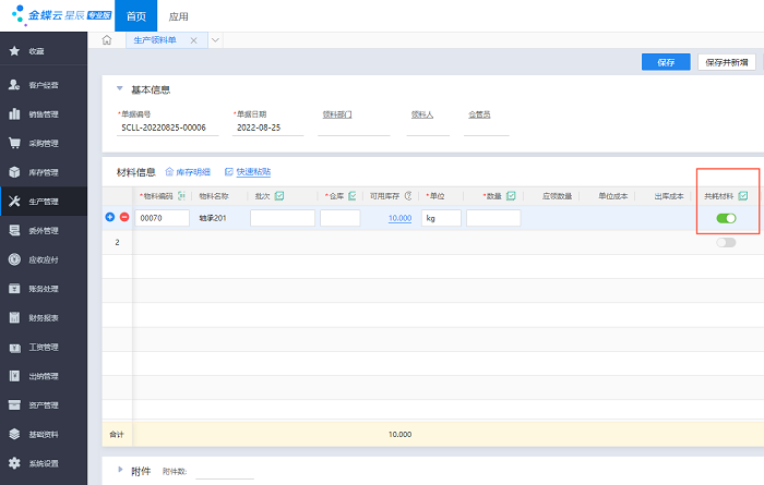 【答】:共耗材料使用场景:生产过程中会存在一些共耗材料的使用,例如润滑油,可能所有产品生产过程中或多或少都会用到一点,且不作为产品的BOM结构。但是这些共耗材料的成本也需要计入产品的产本中,此时需勾选【共耗材料】选项,在费用归集——内部引入时,可配置方案,自动将共耗材料行的成本进行归集。注意事项:若领料单的物料行有源单,则该行的【共耗材料】默认不允许编辑;若物料行为手动新增,则【共耗材料】允许编辑。