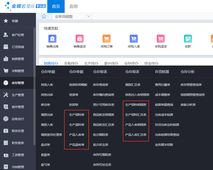 如客户未购买星辰生产管理,也是可以在库存管理-仓存单据里使用生产领料单、生产退料单、产品入库单、产品退库单这4张单据的。