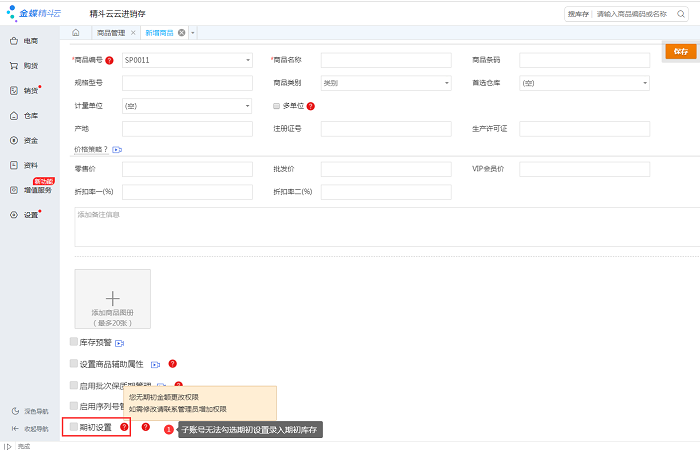子账号在编辑商品时无法录入期初库存,系统提示“您无期初金额更改权限,如需修改请联系管理员增加权限”。