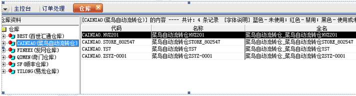2、 菜鸟仓库建立:订单下载时会自动创建单据上对应的菜鸟仓库,如下图。