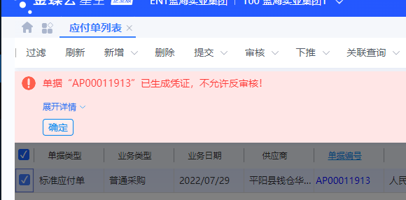 反审核云星空的应付单提示:单据"XXXXXX"已生成凭证,不允许反审核