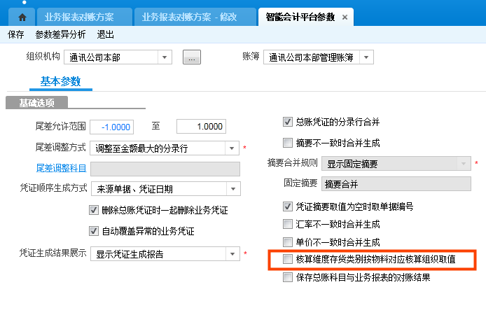 2.存货科目按核算维度存货类别对账,智能会计平台参数“核算维度存货类别按物料对应核算组织取值”,勾选参数凭证生成和报表对账核算维度存货类别按当前账簿对应核算组织下物料的存货类别取值,不勾选时按来源单据上(使用组织)物料的存货类别取值。