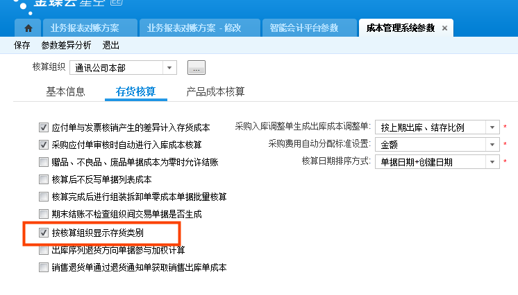 物料在核算组织下级组织存货类别不一样时且存货对账过滤条件设置存货类别,需要在存货管理参数勾选“按核算组织显示存货类别”(2020年5月补丁)