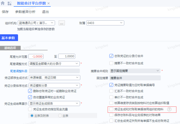 2021年12月份补丁,对账过滤设置存货类别,过统一按智能会计平台参数“凭证生成和对账取使用组织的物料"处理,勾选参数凭证生成和对账存货类别取单据上使用组织的物料,不勾选时取账簿核算组织的。