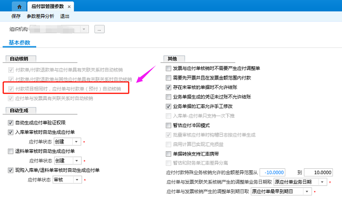 很多错误配置会把以下参数放开锁定性取消勾选,即使取消也是不生效的,原因是只要应付单下推到付款单,付款单保存或审核都会反写应付单的 [付(退)款单关联金额]字段,只要这个字段有值,就不会再参与到付款核销里了,应付付款手工核销和向导式核销等都不会再过滤到这张应付单,所以不能取消上下游关联下推的核销关系。