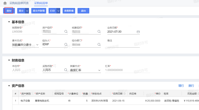 步骤2:点击“新增”按钮进入采购转固单编辑界面,按要求填写采购转固单。