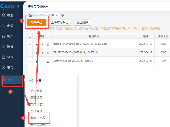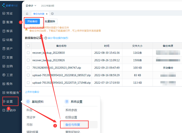 使用账套系统管理员账号,在【设置】-【备份与恢复】中点【开始备份】,可以将当前账套备份完成。