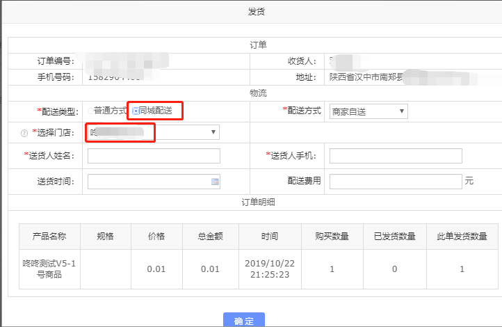 商家订单发货时配送类型可以选择同城配送,不同地址会自动默认距离近的门店配送,,订单详情可以展示门店。