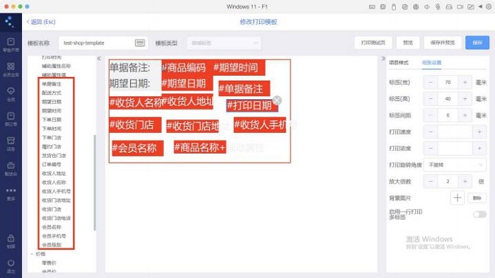 商城标签模板编辑器与⼀般的商品标签相同。左侧区域可添加相关字段,  中间区域可预览和调整字段 位置,  右侧区域可对打印类样式进行调整。编辑完成后,  保存模板,  并将该模板设置为打印模版,  即 可完成模板配置。