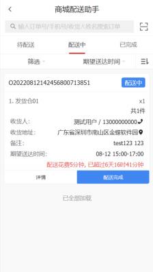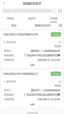 点击 【商城配送助手】 进入查看配送订单, 订单状态包括待配送、配送中和已完成, 可分别对不同状 态的配送订单进行处理。