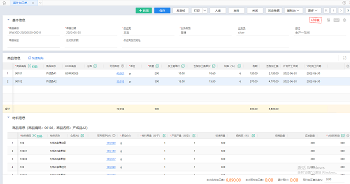 6)添加材料:当添加了商品后,若商品维护了BOM,会自动根据商品携带出已审核的最新版本的BOM的材料;若商品未维护BOM,可以手动添加材料。