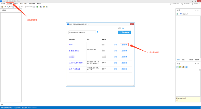 首先在协同开发平台右上角点击“应用管理”,在弹出框中找到你想查看的项目,点击“更多操作”。