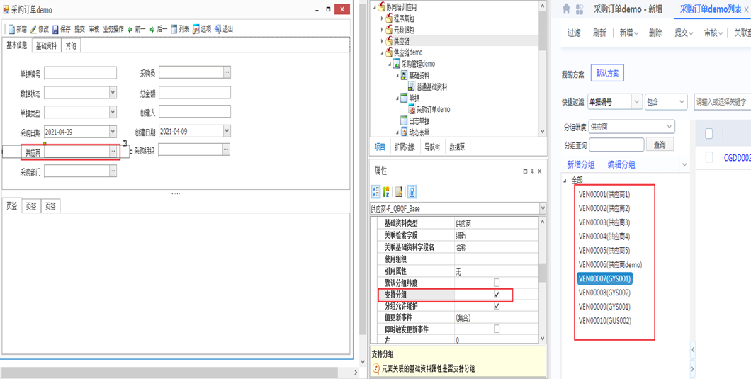 • 勾选支持分组属性后,单据列表展示就会根据供应商分组展示。