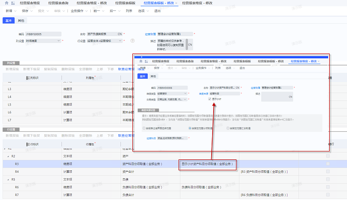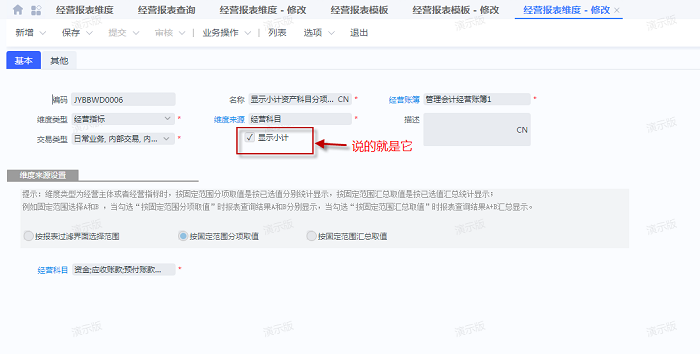 经营报表维度新增时有个勾选项,【显示小计】
