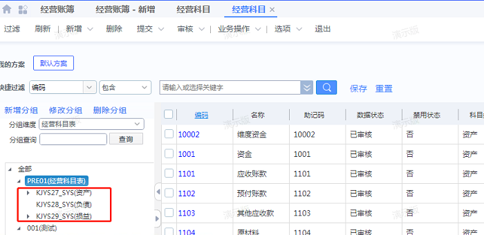 - 经营科目表:存放经营科目的一个经营科目的层次结构。系统预置了三种类别(资产、负债、损益)的科目。而且科目支持多层级展示。