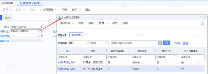 系统默认预置了两个核算体系:财务会计核算体系、责任中心核算体系。