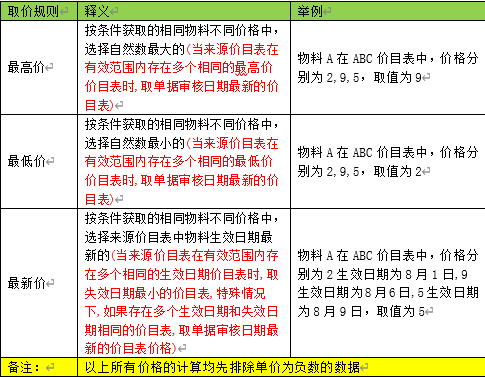 • 取价规则:可选值为最低价、最高价、最新价,规定物料价格的获取规则,具体详细规则如下表1.1。