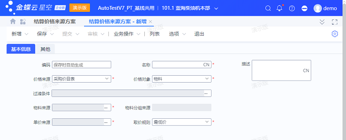 • 物料来源:若价格对象为物料时,则可选,否则锁定