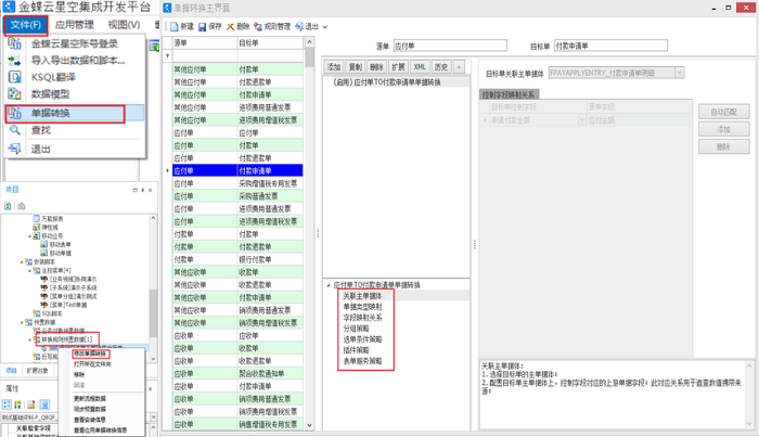 协同开发平台中【文件】 -> 【单据转换】、应用【转换规则预置数据】进入单据转换设计界面。