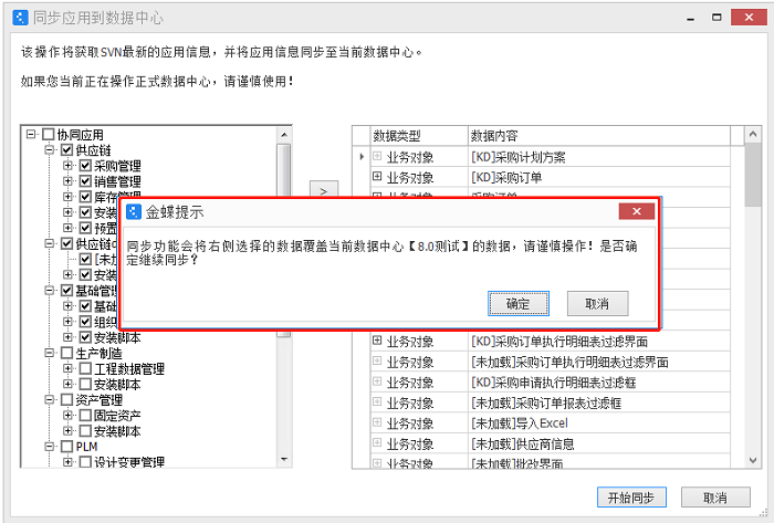 (4)、同步前会再次确认是否同步,注:会将所有勾选的开发成果同步到当前的数据中心,即会覆盖当前数据中对应的开发成果,此过程是不可逆的(任何疑问可加Q群咨询:512478464)。点击“确认”后,协同平台将会开始同步数据,该过程可能耗时较长,请耐心等待数据同步完成。