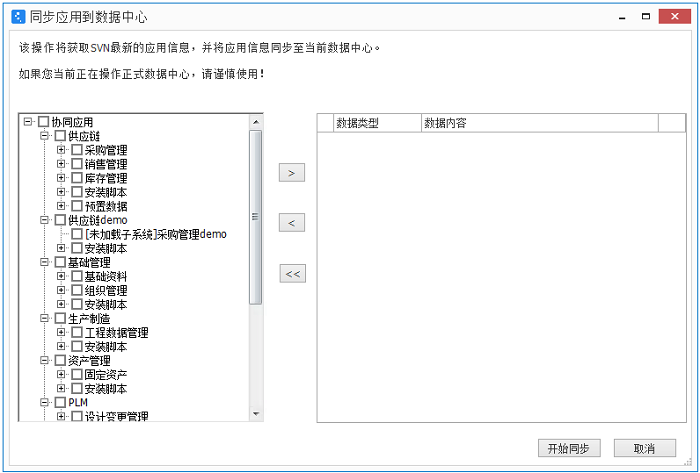 (2)、弹出同步应用到数据中心的窗口,左侧是当前应用的所有的开发成果,右侧是已选内容,中间的“>”“<”“<<”按钮分别为选择当前勾选、删除当前所选、删除全部所选。