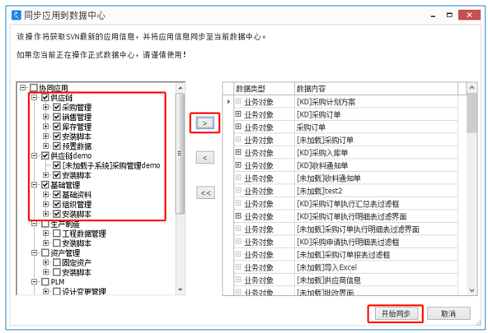 (3)、需要同步应用中哪些开发成果,就把这些开发成果添加至右键。本次我们以同步三个业务领域为例,我们勾选上供应链、供应链demo与基础管理这三个业务领域,点击“>”按钮,右边选择框内会出现这三个业务领域中所有可以同步的数据,确认无误后点击 开始同步 按钮。