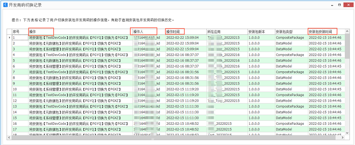 2、开发商码切换记录,如下图: