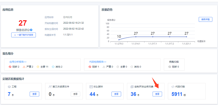 从质量报告界面上,我们可以看到新增了多少的工程,SQL,业务对象,第三方资源文件以及插件的代码行数。