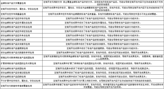 在实际项目中,存在大量客户不敢升级金蝶标准产品的情况,主要原因就是定制化开发成果易于金蝶标准产品发生冲突,导致功能异常。为此我们特意推出了升级预警功能去检测我们定制化开发成果,目前在大量的客户支持中,分析和提炼了共有19个检测项,还在不断增加之中。