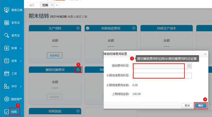 方法一:进入账簿后,点击【结账】--【摊销待摊费用】-点击右上角齿轮--把【摊销费用科目】【长期待摊销费用科目】两个科目留空-点击保存【确定】。