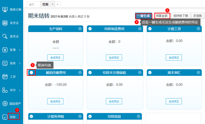 方法二:点击【结转】-点击【测算金额】-把【摊销待摊费用】模块左上角勾选取消-再点击【一键生成】即可不让系统自动生成计提所得税的凭证。